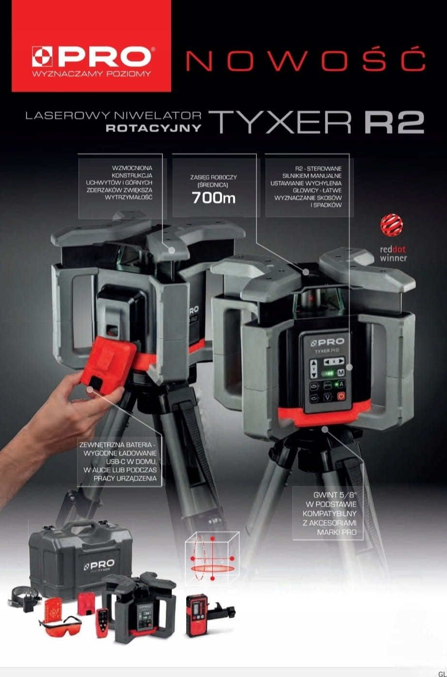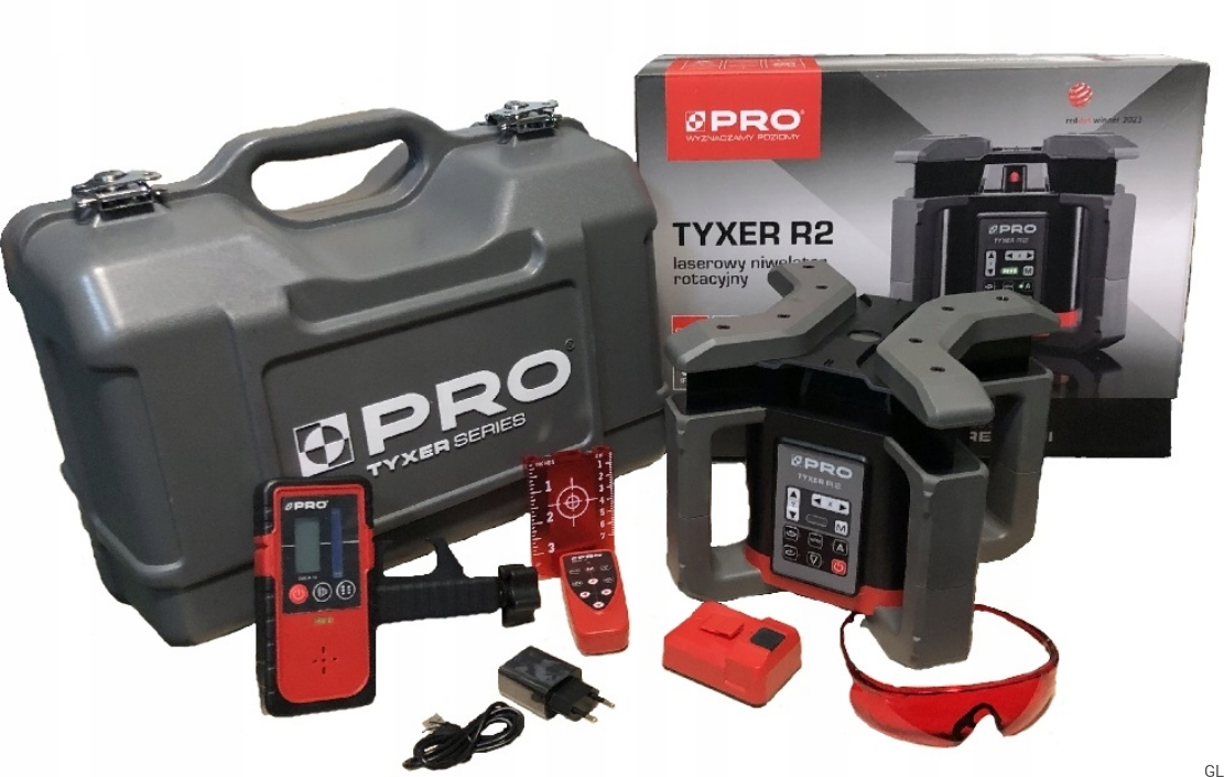 - Zestaw zawiera: Laserowy niwelator rotacyjny PRO TYXER R2, akumulator Li-Ion 7,4V 4000mAh, walizka transportowa, detektor czerwonej wiazki laserowej z uchwytem do łaty, tarcza celownicza laserowa, okulary laserowe, ładowarka sieciowa, USB-C, instrukcja obsługi, pilot zdalnego sterowania